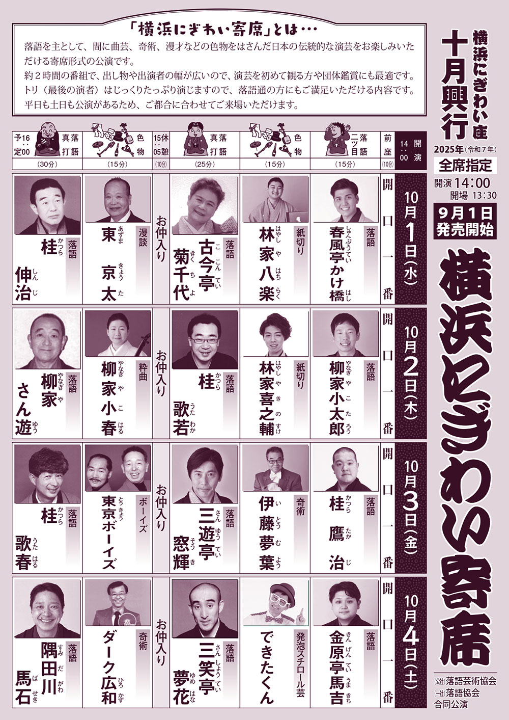 横浜にぎわい寄席 10月1日(水) 2025 年 8 月 30 日 最終更新日時 : 2025 年 9 月 22 日 staff 横浜にぎわい寄席① 横浜にぎわい座 場 所:横浜にぎわい座 日 時:2025年 10月1日(水)14:00開演 伸 治:16:00上がり トリ(主任) FacebookXCopy
