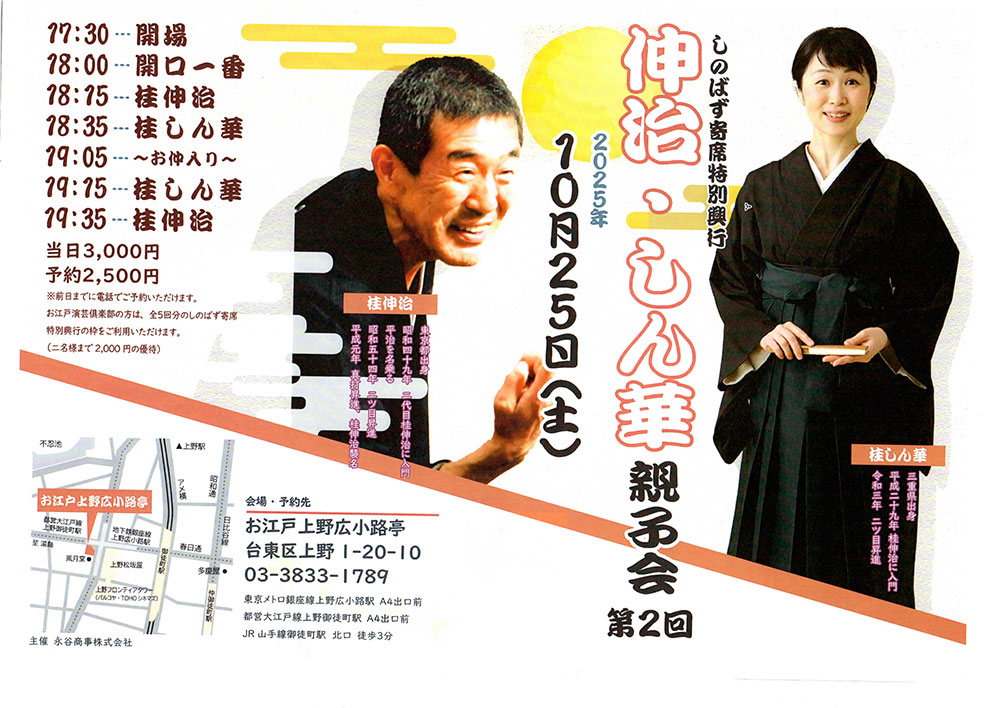伸治・しん華 親子会 10月25日(土) 2025 年 9 月 11 日 最終更新日時 : 2025 年 9 月 22 日 staff 伸治・しん華 親子会 お江戸上野広小路亭 場 所:お江戸上野広小路亭 日 時:2025年 10月25日(土) 17:30開場 18:00開演 木戸銭:当日3,000円 予約2,500円 出 演:桂しん華 桂伸治 内 容:落語二席づつ ご予約受付 FacebookXCopy
