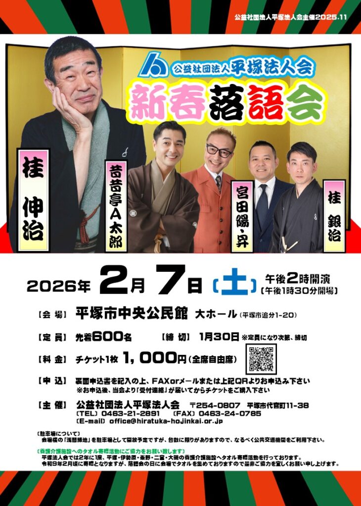 公益社団法人平塚法人会 一般公開事業 新春落語会(事前申込制)2月7日(土)
