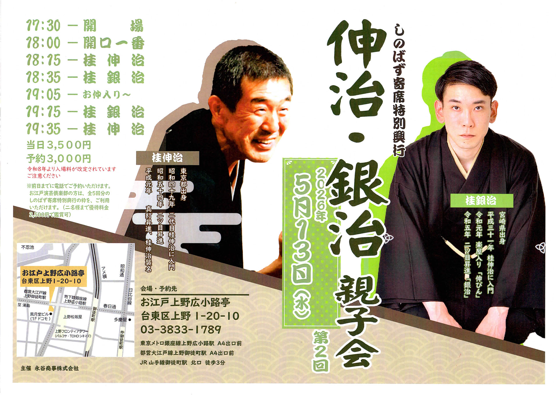 伸治・銀治 親子会 5月13日(水) 2026 年 4 月 14 日 最終更新日時 : 2026 年 4 月 20 日 staff 伸治・銀治 親子会 お江戸上野広小路亭 場 所:お江戸上野広小路亭 日 時:2026年 5月13日(水) 17:30開場 18:00開演 木戸銭:当日3,500円 予約3,000円 出 演:桂伸治 桂銀治 予約:03-3833-1789(お江戸上野広小路亭) FacebookXCopy